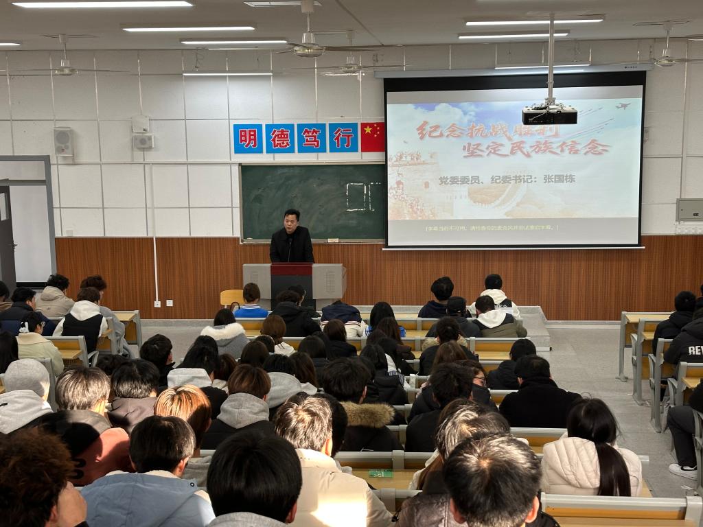 近日,校党委委员、纪委书记张国栋在综合楼205为2023级学生讲授题为“纪念抗战胜利,坚定民族信念”的形势与政策课。
